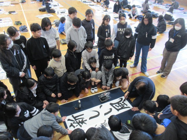 令和8年になってから初めての学校行事である「校内書き初め会」が1月8・9日に行われました。1・2年生は各教室で行い、3~6年生は書写の授業でご指導頂いている大録先生をゲストティーチャーにお招きして体育館で各学年ごとに行われました。どの児童も一文字一文字願いを込めながら集中して書いている姿が印象的でした。