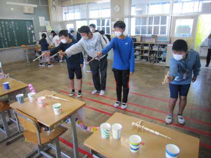 6年生は職業当てクイズを中心に、遊びの要素を取り入れたパビリオンを準備中です。タブレットでクイズを作成し、問題を回答していくという高学年らしい取組に合わせて、射的や景品の遊び心もある内容です。参加する学年に応じた工夫も見られます。6年生のがんばりが、喜びにかわる最後の中根フェスティバルになることでしょう。