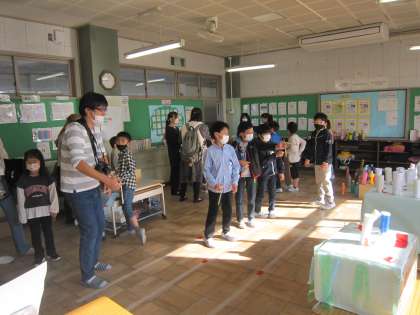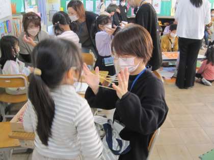 1年生から3年生は、先生と一緒に考えながら決めた体験コーナーをパビリオンとして実施しました。自分で考えた言葉で、参加者に説明しながら楽しむ姿がたくさん見られました。各バビリオンで体験し、スタンプラリーカードにシールを貼りながら巡る体験活動を、心から楽しんでいました。