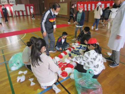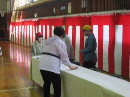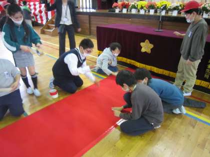 明日の入学式に向けて、高学年の児童が入学式の会場準備を行いました。紅白幕を張ったり、椅子を並べたり、机にクロスを掛けたりと、進んで働く姿がたくさん見られました。会場も素早く準備でき、さすが自慢の中根っ子の高学年です。
