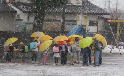 雪の降る中、児童たちはカレンダーを楽しんで作りました。