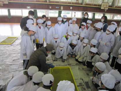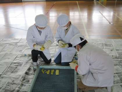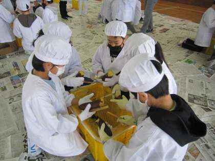 3年生は例年この時期に、干し芋作り体験を行っています。中根ファームで栽培から収穫までお世話になっている専門家にご指導をいただきながら、干し芋作りに挑戦しました。まずは作り方の手順の見本を示していただき、ひとり一本を、皮むきから並べる作業までの流れを体験しました。体育館内に広がる甘い香りに包まれながら、食べたい気持ちを我慢して作ることができた中根っ子です。