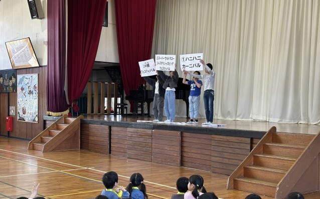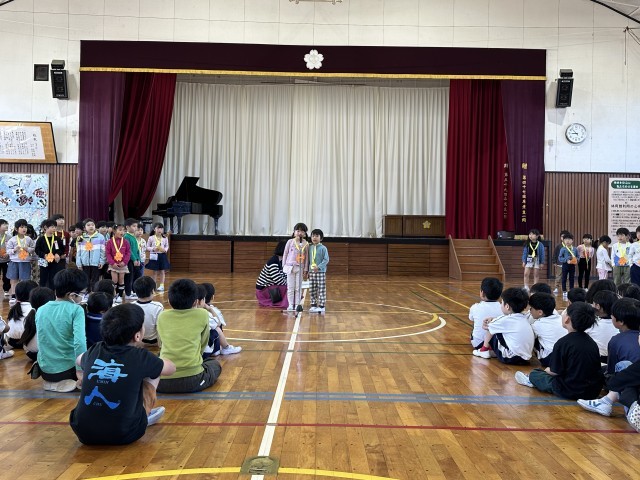 5・6年生が企画・運営をしてくれた1年生を迎える会は、手作りのハニーちゃんメダル贈呈や中根小クイズなどのコーナーがあり、みんなの笑顔があふれるあたたかな会となりました。1年生は、中根小に入学してまた一つ思い出がふえましたね。さあ、次はどんな思い出ができるでしょうか。