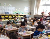 • 今日から1年生給食開始