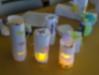 3年生が、ペットボトルやプラ容器、空きビンなどの空き容器に、絵の具で色を付けた紙...