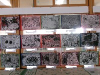 3年生の教室前には、図工で制作した紙版画が掲示されています。様々な素材の紙をつか...
