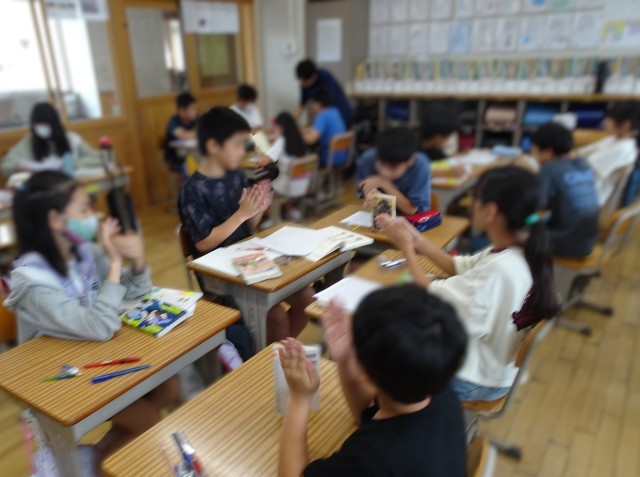 3年生が、国語で学習した俳句の中から心に残った1句を選び、その情景を絵で表現する授業を行いました。想像を膨らませて、色彩豊かな絵を一生懸命描いていました。6年生は、国語の学習で自分が興味をもった本の紹介文を書き、それをグループの友達に発表していました。その本の面白かったところや感動する場面など、友達の発表をしっかりと聞いていました。