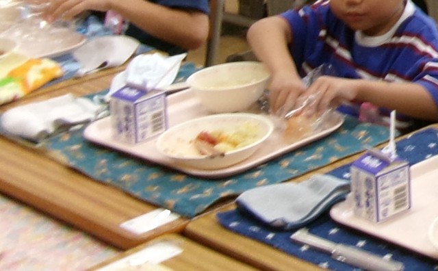 夏休み前の給食は今日が最終日。今日の主食はパン、メインのおかずは子供たちに人気のハンバーグです。みんな美味しそうに食べていました。