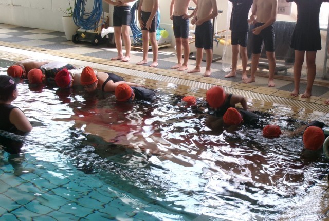 写真は2年生の様子です。去年は、水に顔がつけらない子もいましたが、今日はみんな頑張っていました。授業が始まって10分もたつと、水にすっかり慣れ、バタ足をしたり潜ったりして歓声が上がっていました。