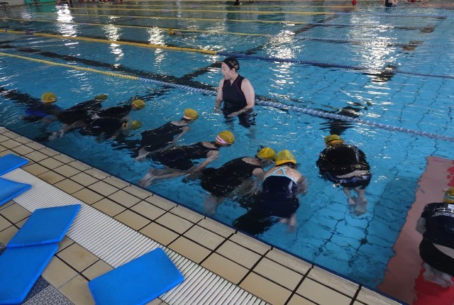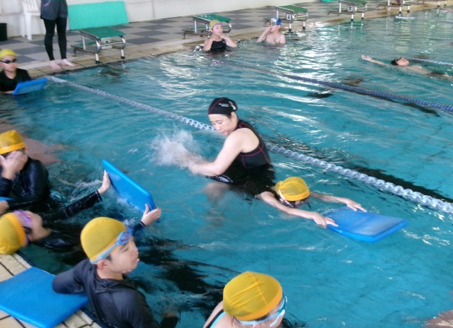 写真は5年生の水泳学習の様子です。一人一人足の動かし方を教えてもらい、ビート板を使ってきれいなフォームで泳げるよう頑張っていました。また、違うグループは、コーチのカウントに合わせてしっかりと潜ることができていました。