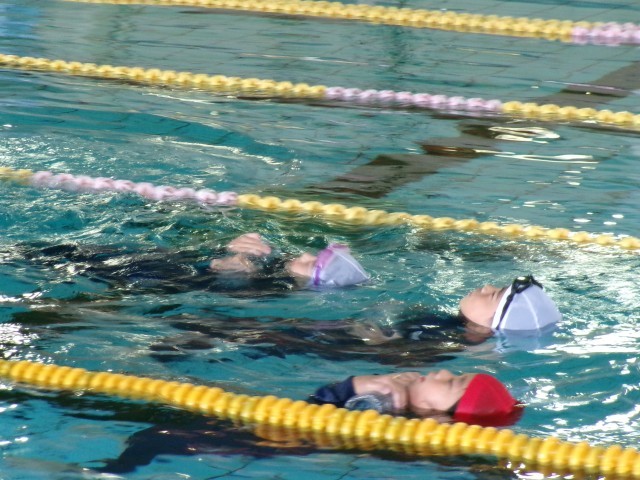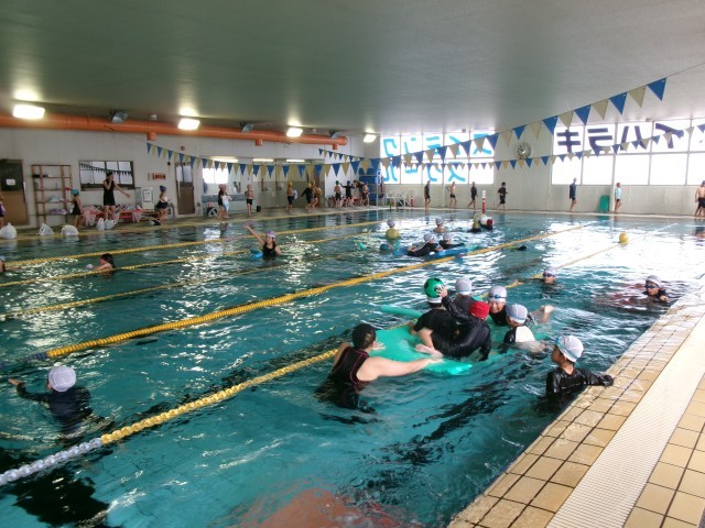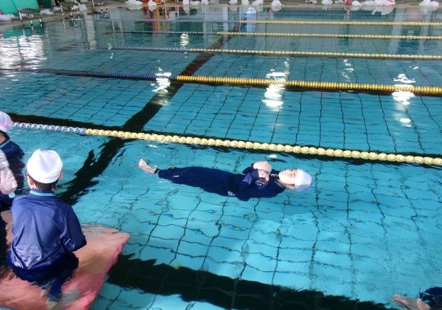 今日は、3,1、5年生が今年度最後の水泳学習で、3,5年生は着衣泳を実施しました。写真は3年生の様子です。ジャージを着て水に入ると、体が重くなって動かせないことを実感した後、ペットボトルや膨らませたビニール袋を抱えて浮く体験をしました。最初は苦戦していましたが、コツを教えてもらい練習していくと、上手に浮くことのできる子供たちが増えました。水の怖さも理解し、いざというときに役立つ学習となりました。最後は、楽しく歓声をあげて遊ぶ様子が見られました。