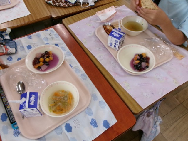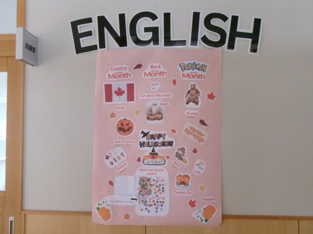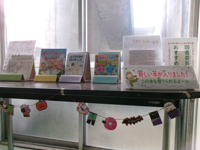 学校のあちこちにハロウィンらしさが・・。給食は先週のメニューです。フルーツポンチが紫色とオレンジ色で、「ハロウィンだ!」と子供たちは喜んでいました。職員玄関にもかぼちゃやオレンジ色の花を飾ってあります。エングリッシュコーナーや図書室の入り口もハロウィンの雰囲気です。