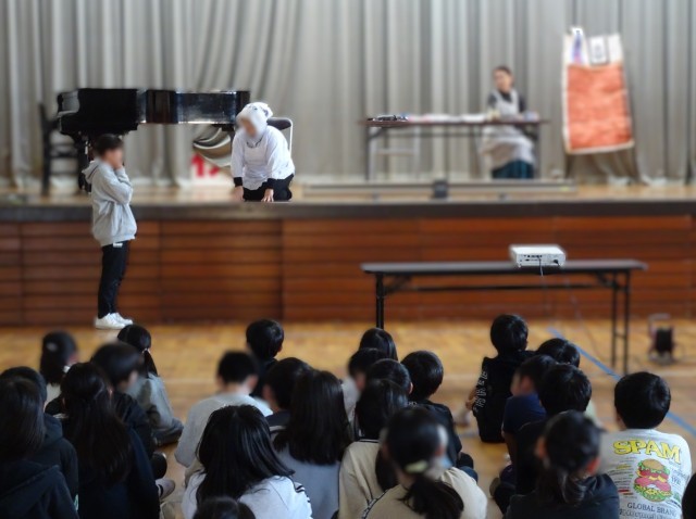 5校時に、4年生が認知症サポーター養成講座を受講しました。前半は、スライドを見ながら認知症についての説明を聞き、理解を深めました。後半は、認知症の方への対応の仕方について、悪い例と良い例を劇にした内容で、わかりやすく学ぶことができました。子供たちは、認知症の方に対して優しく受け止めて接することの大切さを実感することができました。