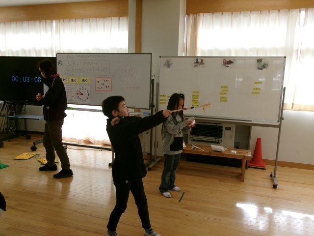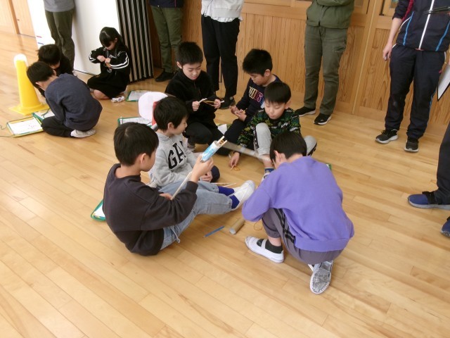 写真は、今日の2年生の図工の授業です。自分の作ったおもちゃを、より遠くに飛ばしたり、速く動かしたりするにはどうしたらよいかを考え工夫していました。グループで互いにアドバイスし合ったり、輪ゴムや割り箸の本数を増やしたりして試行錯誤しながら、夢中になって学習する姿が見られました。