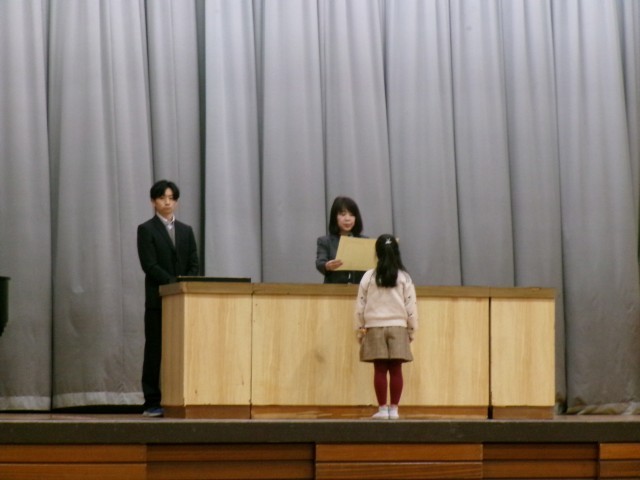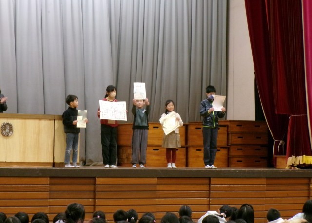 今日は、たくさんの表彰を行いました。書道、絵画、読書推進、持久走など、これからも自分の得意分野やよさを伸ばしていくこと期待しています。また、長期休み前ということで集会をもちました。明日から、安全に楽しい冬休みを過ごしてほしいと思います。よいお年をお迎えください。
