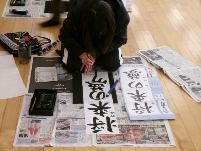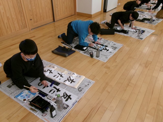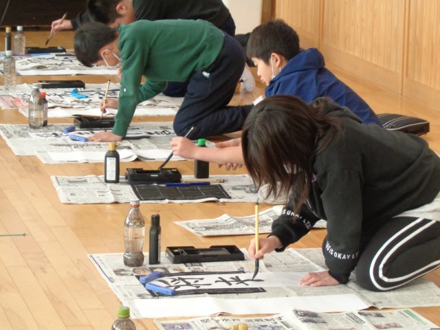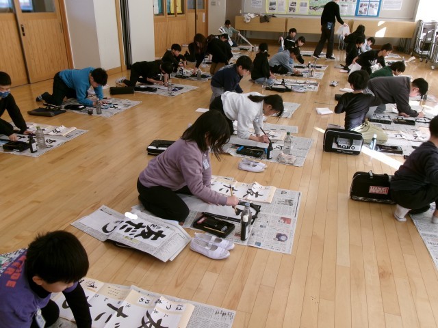 写真は、6年生と3年生の書き初めの様子です。3年生は、今年から毛筆の学習をしています。大きな文字はバランスが難しそうでしたが、みんな真剣なまなざしで条幅に向かっていました。6年生はさすが最高学年。落ち着いて、とめ、はらい、など丁寧に筆を運んでいました。
