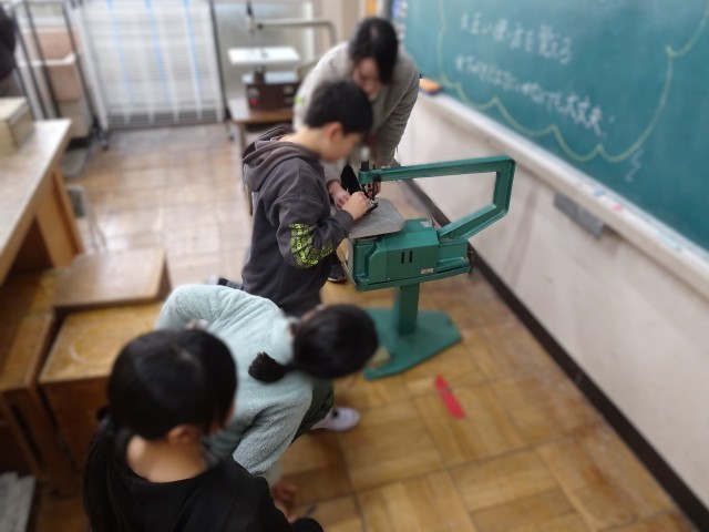 5年生の図工で、電動糸のこぎりを使って「ホワイトボード」を製作する学習が始まりました。第1回目の今日は、糸のこぎりの取付方や動かし方の説明を受けました。安全に製作できるように、子供たちは真剣に話を聞いていました。