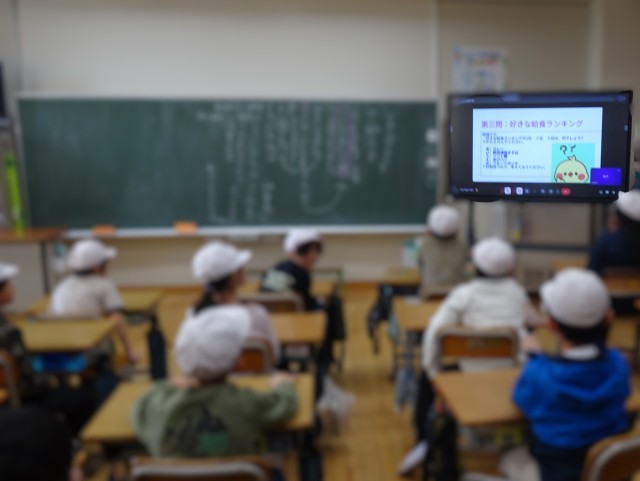 給食委員会の児童が、オンラインによる給食集会を実施しました。給食の歴史や栄養の大切さについて委員会の児童がスライドにまとめ、紹介しました。また、代表の児童から調理員の方へ感謝のメッセージを渡しました。調理員の方から「バランスのよい給食作りの工夫の一つとして、たくさんの食材を使うようにしています。給食の中に食材がいくつ入っているか数えてみるのもいいですね。」という話がありました。