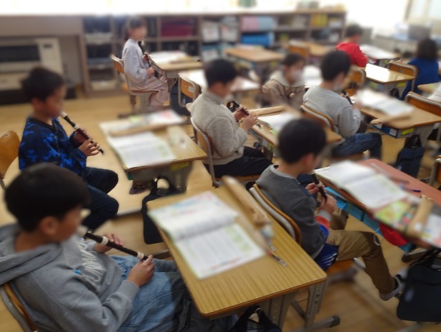 3年生が音楽でリコーダーの練習をしました。「パフ」という軽快な曲を先生の手拍子に合わせて、一生懸命吹いていました。パート毎の練習では、友達と互いに演奏を聴き合いながら、アドバイスをしていました。全員の合奏では、素敵なハーモニーが響いていました。