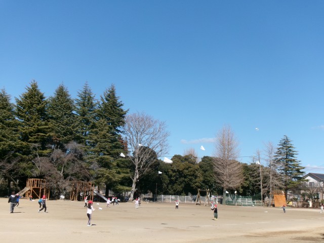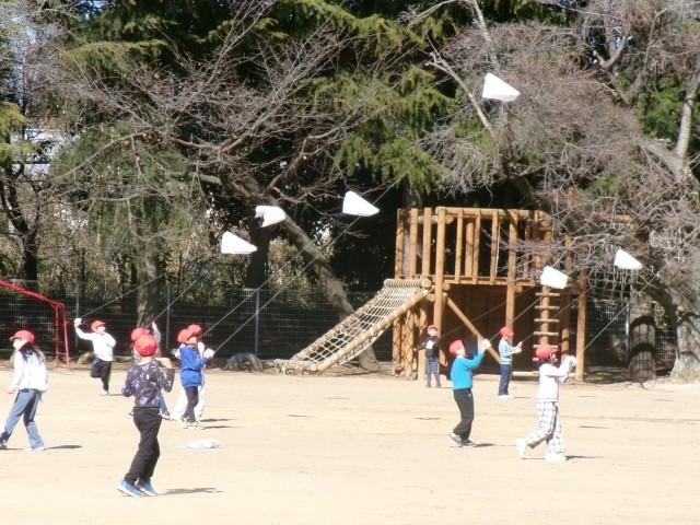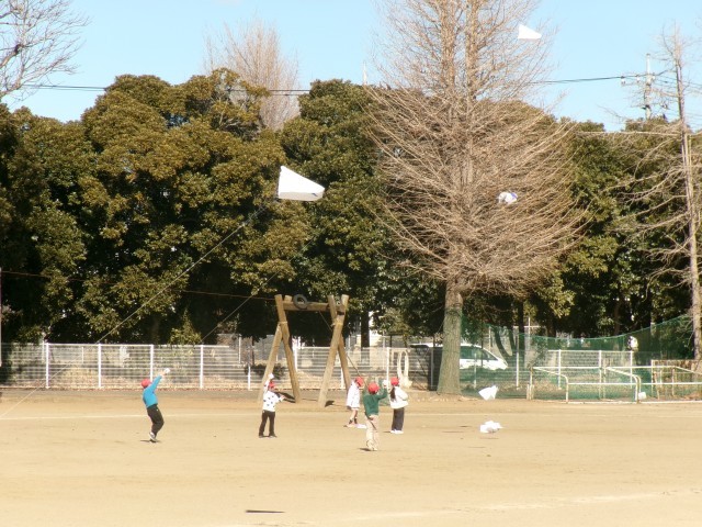 1年生が生活科の学習で、作った凧を揚げていました。今日は、真っ青な冬空のもと、風もあり、凧揚げにはベストコンディションでした。子供たちは、糸を引っ張ったり、走ったりして高く上げようと頑張っていました。