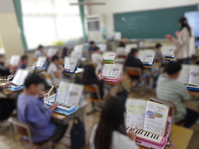 2年生の教室から、鍵盤ハーモニカの音色が聞こえてきました。「こぐまの二月」の曲を上と下のパートに分かれて演奏していました。みんな笑顔で楽しそうに素敵なハーモニーを響かせていました。