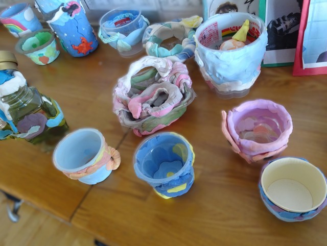 3年生の教室に、図工で制作した作品が並べられました。ペットボトルやプラ容器などの空き容器が、色とりどりの素敵な作品に生まれ変わりました。