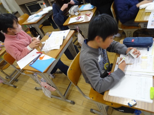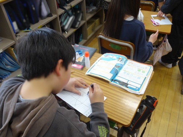 5年生が算数の「角柱と円柱」で、工作用紙に三角柱の展開図を描き、実際に三角柱を作る学習をしました。教科書の展開図をもとに、定規とコンパスを使って丁寧に描き、はさみで慎重に切り取っていました。完成した三角柱を手に、満足そうな笑顔が見られました。