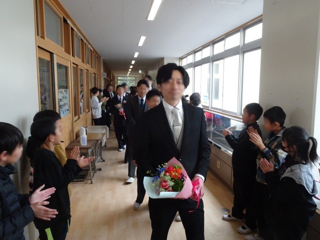 4・5年生と職員が廊下の両脇に並んで花道を作り、卒業生と保護者の方を拍手で見送りました。中学校での活躍を期待しています。