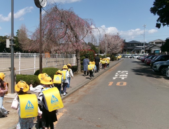 今日から、1年生が登校班で通学してきました。全校児童揃っての学校生活のスタートです。朝、元気にあいさつをする1年生がたくさんいてうれしく思いました。写真は朝の登校の様子と下校の1年生の様子です。学校の桜は満開です。