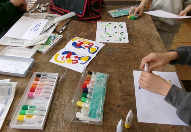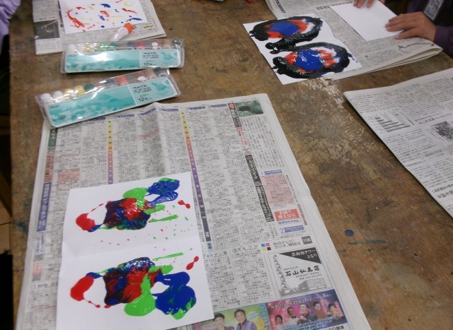 写真は4年生の図工の学習の様子です。折った紙の内側片面に、絵の具を三色置き、合わせてから開いていました。デカルコマニーという技法です。子供たちは開いたときの色の混ざり方や形に歓声を上げていました。