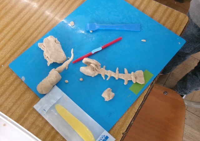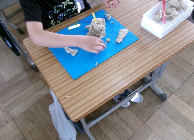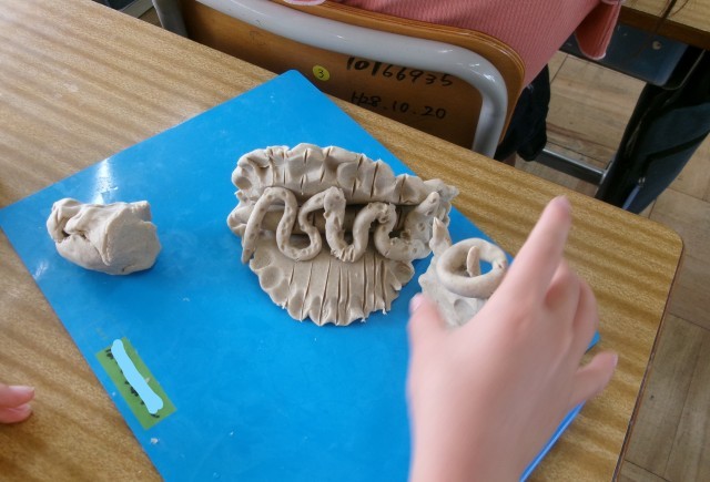 写真は、昨日の2年生の図工の授業の様子です。粘土で様々な形を作っていました。「これは魚の骨だよ」「これは恐竜」「これは貝の中から・・」など、子供たちは夢中で説明してくれました。教えられて、または、お手本通りに作るのではなく、自分がつくりたいものを作ると、こんなに思いをもち豊かなことばで説明できるのだと驚きました。