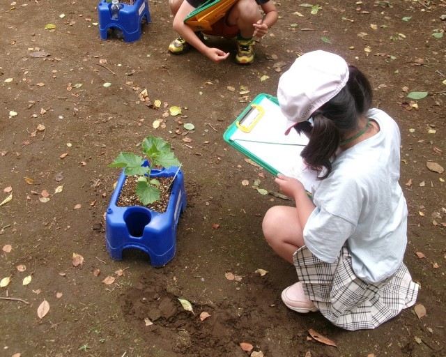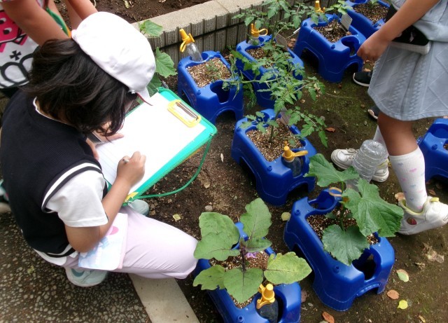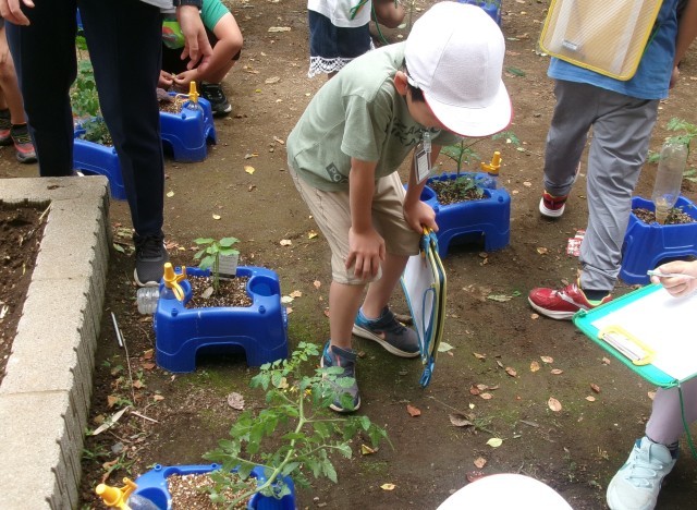 2年生が、先日生活科で植えた夏野菜の成長を観察していました。「キュウリの葉っぱはちくちくしている」「キュウリは支柱があったほうがいいな」「ナスと同じ色の紫の花がさいてる」「トマトの葉っぱはトマトっぽい匂いがする」など、五感をフルにつかっていました。キュウリ、ナス、ミニトマト、オクラ、ピーマンなど、それぞれが植えた苗は、これからぐんぐん育つことでしょう。観察が楽しみですね。