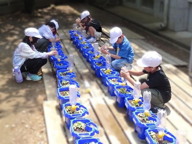 1年生はアサガオに水をあげていました。愛情こめて育てたアサガオが綺麗に咲く日が待ちどおしいです。