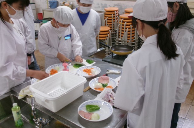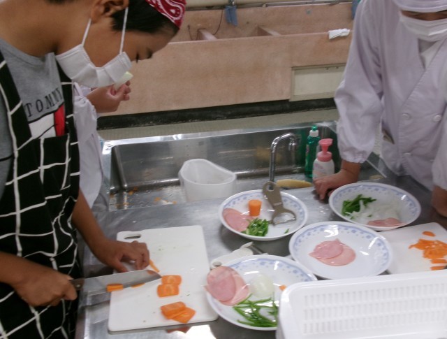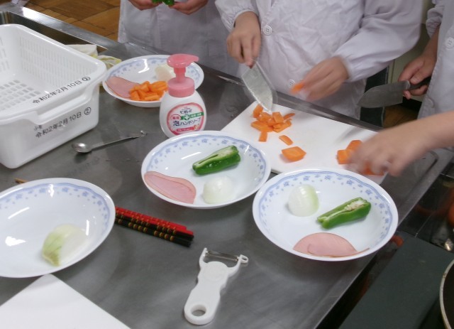 6年生が、彩りのよい野菜炒めを調理実習でつくりました。にんじんの短冊切りに苦戦していました。日頃給食では野菜を残してしまう子供たちも、美味しい美味しいと食べていたようです。ぜひおうちでも、家族のためにつくってほしいと思います。