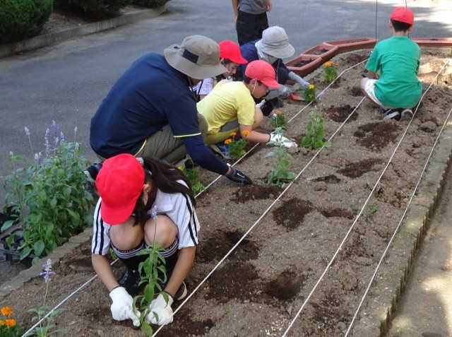 飼育・環境委員会の児童が、花壇の植え替え作業を行いました。保護者ボランティアの方々にもご協力いただき、マリーゴールドとブルーサルビアのきれいな夏花壇が仕上がりました。ありがとうございました。