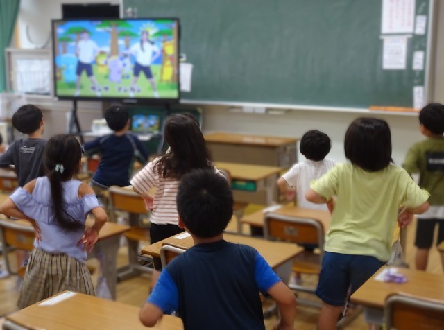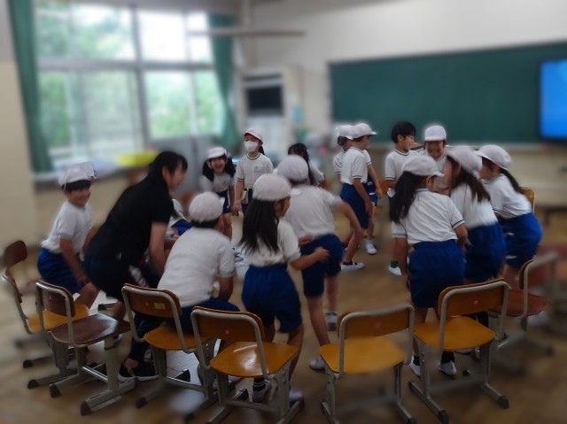 今日はロング昼休みの日でしたが、あいにくの雨で室内遊びとなりました。1年生がダンスの映像に合わせて楽しく踊る姿や、2年生がフルーツバスケットで盛り上がっている姿が見られました。その他の学年でも、友達とカードゲームをしたり、おしゃべりをしたりして仲良く過ごしている様子が見られました。