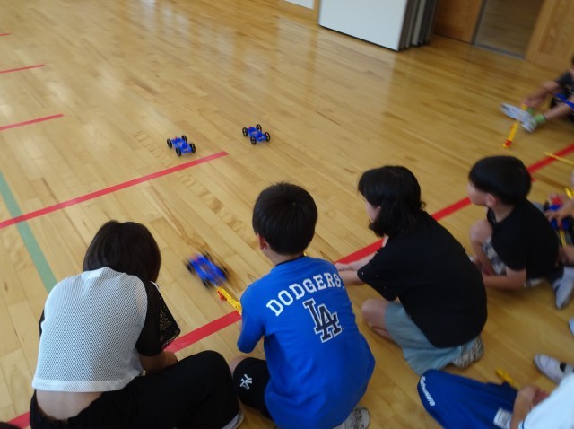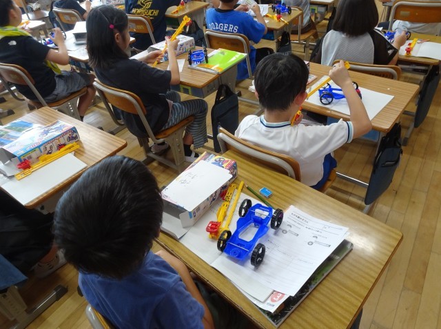 3年生が「ゴムの力のはたらき」の学習で、車の模型を使った実験を行いました。自分で組み立てた車を、ゴムを伸ばす長さを変えながら夢中で走らせていました。模型の車を使った体験を通して、楽しみながらゴムを伸ばす長さと力の大きさの関係に気付いていました。
