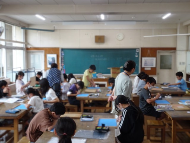 5年生が、図工の学習で木版画の製作を始めました。彫刻刀を使うのは久しぶりだったので、緊張気味な様子が見られました。削りすぎやけがに注意しながら、夢中で取り組みました。サポーターの方には子供たちの安全を見守っていただきました。ありがとうございました。