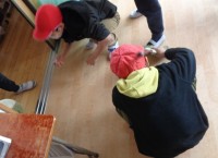 各家庭からたくさんの材料を持ち寄り、2年生がおもちゃを作りました。ゴムを使った車...