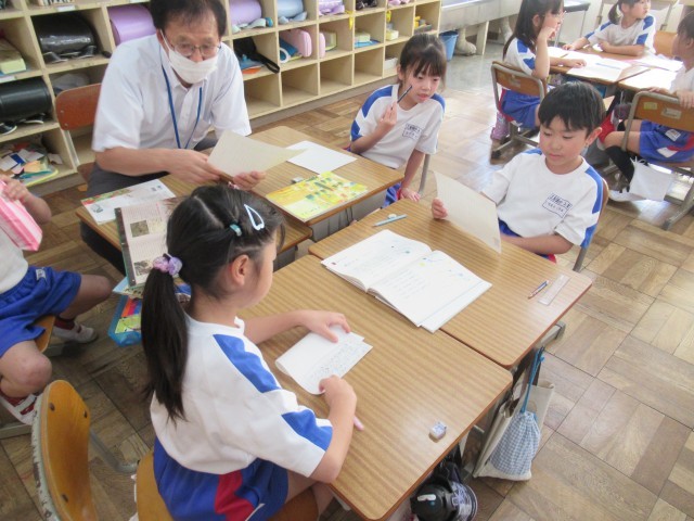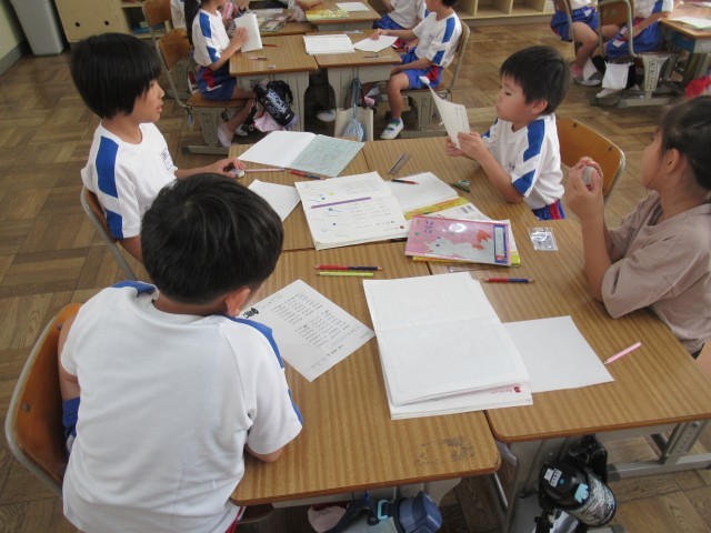 2年生の国語では、「雨のうた」という詩の学習を行いました。リズムに乗せて音読をした後、それぞれが自分で文をつけ足して、オリジナルの詩を作りグループごとに発表会を行いました。