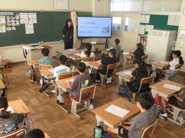 今日は、3・4年生の食育指導が行われました。勝田第一中学校の先生から食育の大切さを教えていただきました。