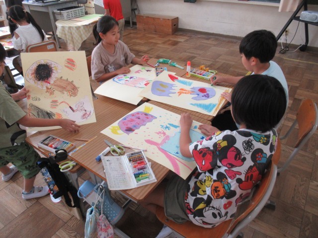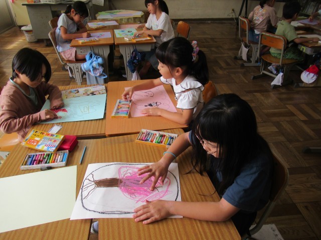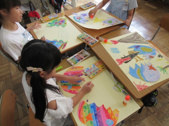たまごから、どんな世界が飛び出してくるのかを思い思いに描く単元です。前の授業で習ったことを生かしクレヨンを指でぼかしたり重ねたり、工夫しながら取り組む姿が見られました。恐竜やかわいい動物、キラキラした雪の世界等、どの作品も子供達の豊かな発想であふれていました。
