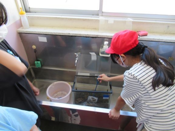 今日は天候もよく、中休みには大勢の児童が屋外で過ごしていました。校庭の奥の草むらでは、2年生がトカゲやカナへビを一生懸命に探していました。捕まえたトカゲをプラスチックケースに入れ、「先生、見て見て」と自慢げに話しかけられました。校庭の中央では、中学年と高学年の児童、先生が一緒に楽しそうにドッヂボールで遊んでいました。昼休みに校舎内を見て回ると、高学年の生き物係がカニの入った水槽をきれいに洗っていました。三反田小は河川から離れてはいますが、時々校庭にサワガニを見かけます。図書室では、静かに読書をしている児童がいたり、図書委員会の児童が本の貸し出しや返却の手続きをしたりしていました。休み時間には、授業中とはまた違った子供たちの姿を見ることができます。
