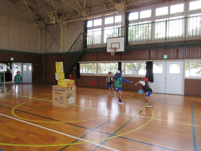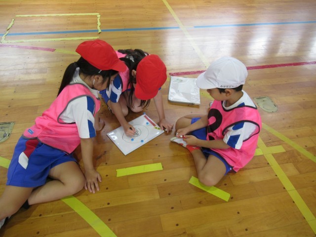 低学年は、体育で「めだまやきシュートゲーム」を行っています。二重円の真ん中に箱を積み、外側からボールを当てて箱を落とした分だけ点数が入ります。チームごとに、攻めや守りの作戦を考え、工夫ながら取り組んでいます。