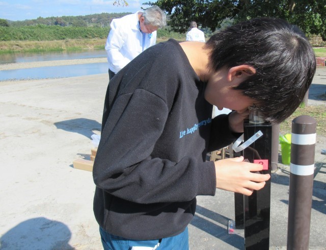 2つ目の調査地点である中流(途中の河川敷)でも同様に水質調べを行い、最後は2地点の調査結果を比較し、透明度や匂いの違いを明らかにしました。