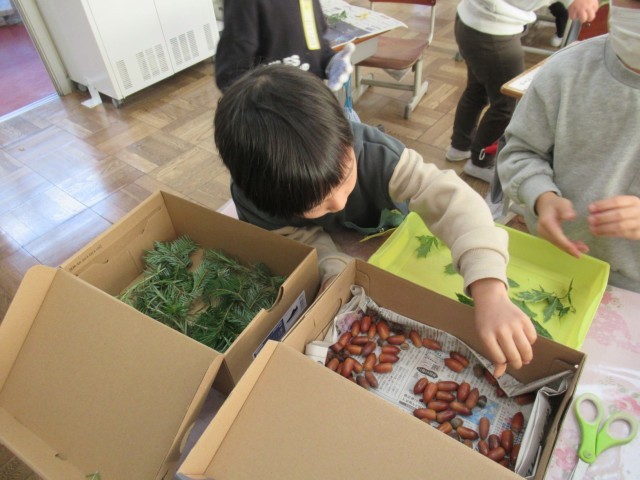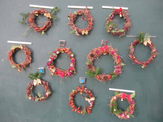 今日は、1年生が、夏に育てていたあさがおのつるでリースを作りました。グルーガンで、ドングリ、葉っぱ、千日紅のドライフラワー、リボンなどの飾りを付けると、すてきなリースが出来上がりました。家で部屋や玄関に飾るのが楽しみですね。