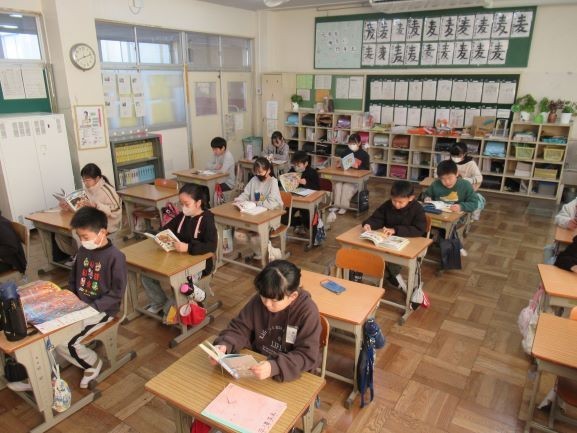 4年生、朝の読書の時間、自分で選んだ本を落ち着いて読むことができました。