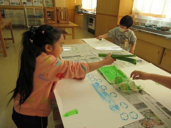 1年生、図工の時間に野菜を使ったスタンプで、きれいな模様の作品を仕上げました。