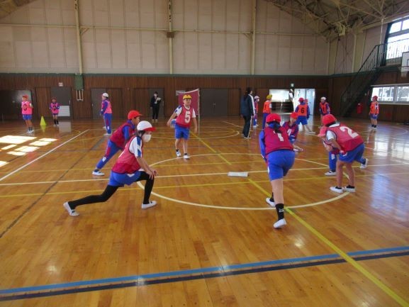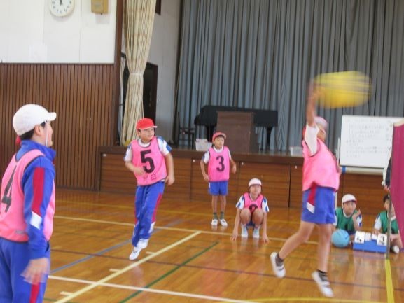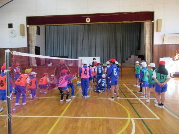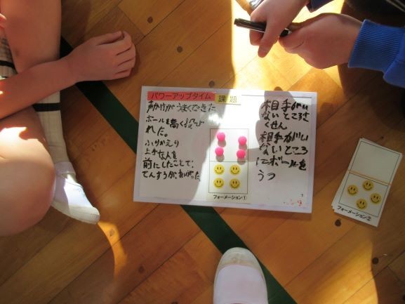 3,4年生が体育の授業で「キャッチバレーボール」を行いました。最初にチームに分かれて準備運動やストレッチを行い、その後、作戦ボードを活用して作戦を立てました。2試合行い、試合の後は作戦タイムを設けました。チームでタブレットで撮影した動画を見ながら攻撃方法を話し合ったり、パスの練習をしたりする様子は、真剣そのものでした。最後は一人一人が振り返りカードを書き、作戦で工夫した点を発表し合いました。