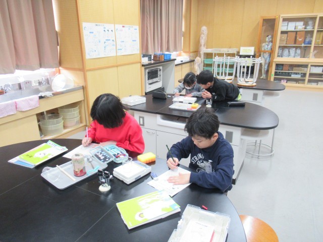 電子はかりを使ってものを1つずつ量ると、「思ったより軽かった!」「違うものなのに、同じ重さのものがあった。」等新たな発見が多く見つかりました。次回は、「同じ大きさでも、違うもので作られていると重さは違うのか?」という実験です。様々な考えが出て、実験の予想を立てている姿も見られました。